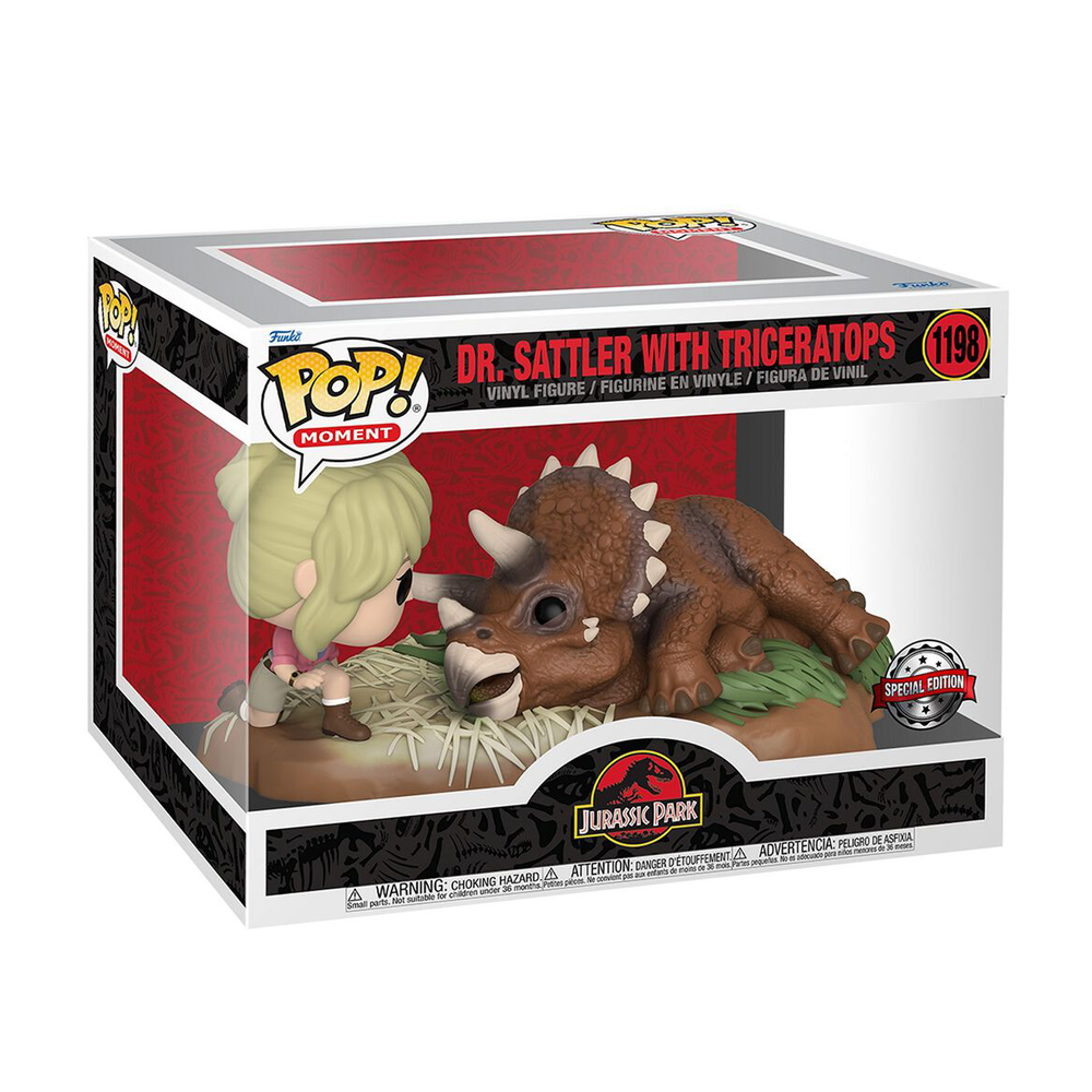 Figura funko pop de Dr. Sattler con triceratops de Jurassic Park.